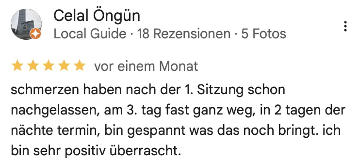 Das hängt von Ihren Beschwerden ab. In der Regel umfasst die Therapie 3 bis 6 Termine. Nach der Analyse im Ersttermin können wir Ihnen eine realistische Einschätzung geben.